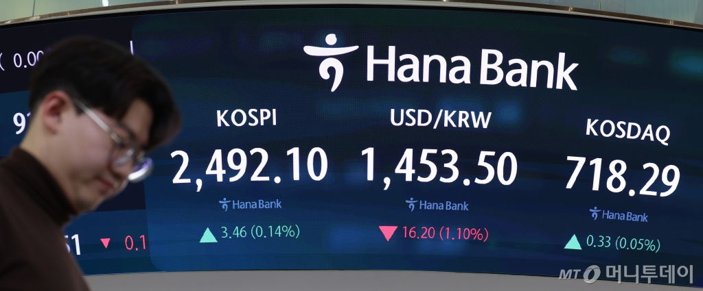 ![[서울=뉴시스] 이영환 기자 = 코스피가 전 거래일(2488.64)보다 3.46포인트(0.14%) 오른 2492.10에 장을 마감한 7일 오후 서울 중구 하나은행 딜링룸 전광판에 지수가 표시되어 있다. 코스닥 지수는 전 거래일(717.96)보다 0.33포인트(0.05%) 상승한 718.29, 서울 외환시장에서 원·달러 환율은 전 거래일(1469.7원)보다 16.2원 내린 1453.5원에 주간 거래를 마감했다. 2025.01.07. 20hwan@newsis.com /사진=이영환](https://thumb.mt.co.kr/cdn-cgi/image/f=avif/21/2025/01/2025010716160576519_1.jpg)