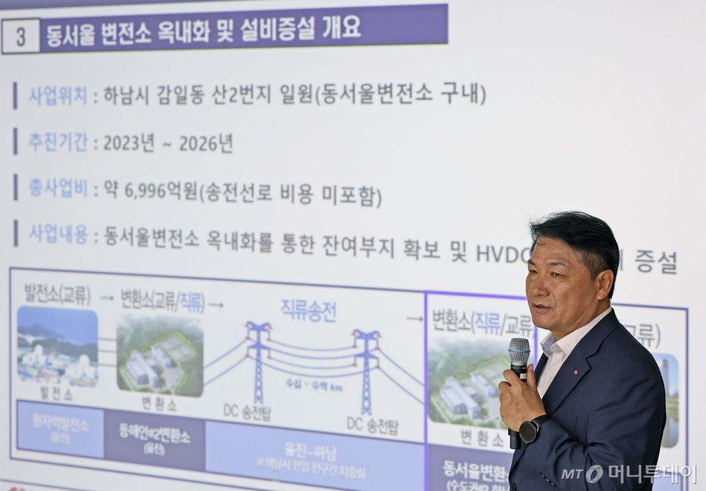 ![[서울=뉴시스] 김금보 기자 = 정두옥 한국전력 HVDC 건설본부장이 23일 서울 서초구 한전아트센터에서 열린 하남시 동서울변전소 옥내화 및 증설사업 불가처분 관련 한국전력공사 입장발표 기자회견에서 사업에 대해 설명하고 있다. 2024.08.23.](https://thumb.mt.co.kr/cdn-cgi/image/f=avif/21/2025/01/2025012210230624272_1.jpg)