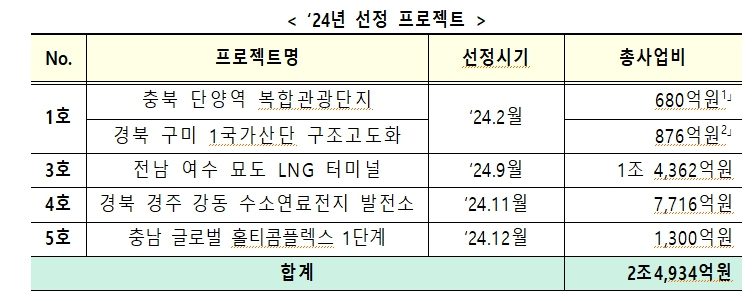 특히 1~3호 프로젝트(△충북 단양역 복합관광단지 △경북 구미 1국가산단 구조고도화 △전남 여수 묘도 LNG(액화천연가스) 터미널)의 경우 민간투자 유치까지 완료돼 자펀드 결성 및 착공이 시작된 상태다.