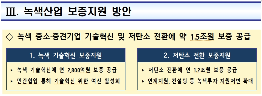 정부는 녹색산업에 대한 금융지원 확대와 글로벌 경쟁력을 갖춘 녹색기술 기업의 육성 등으로 산업 전반의 저탄소 전환을 가속화한다는 방침이다. 현재 전세계 녹색경제 규모는 7조2000억달러(1경원)로 추정되며 주요국들은 탄소중립과 녹색성장을 위해 매년 투자를 늘려가고 있다.