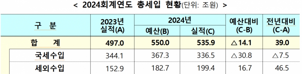 지난해 총세입과 총세출은 각각 535조9000억원, 529조5000억원으로 집계됐다. 총세입은 예산(550조원)에 반영된 것보다 14조1000억원 감소했다.