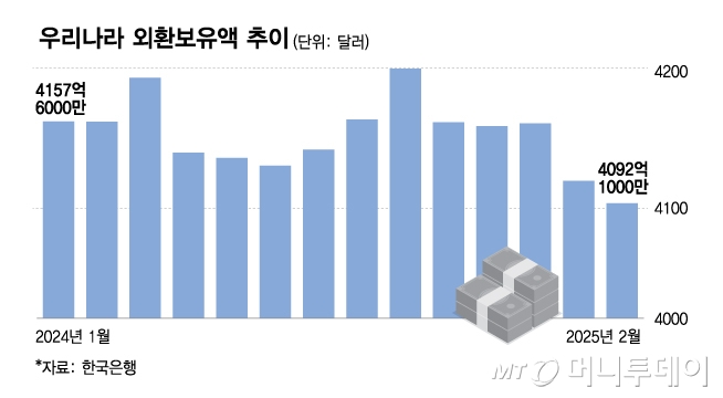 한국은행이 6일 발표한 '2월말 외환보유액' 통계에 따르면 지난달 말 기준 우리나라의 외환보유액은 4092억1000만달러로 전월 대비 18억달러 줄었다.
