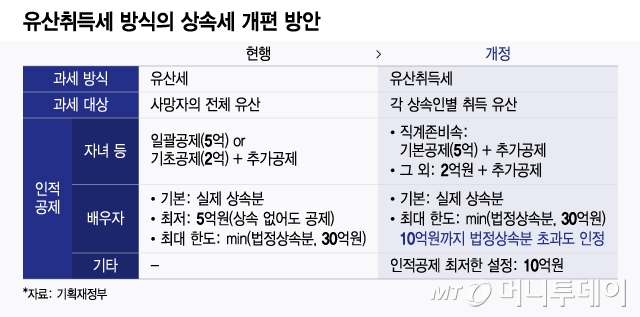 정부가 추진하는 유산취득세를 가장 쉽게 설명하면 대략 배우자 10억원, 자녀 각각 5억원씩 물려주면 상속세를 물리지 않겠다는 것이다.