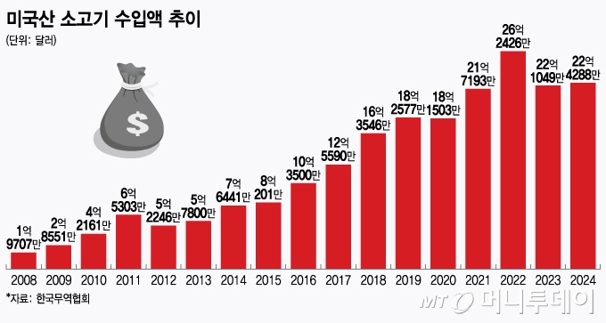 2012년 한미 자유무역협정(FTA)이 발효된 이후 국내에서 미국산 소고기에 대한 수요는 빠르게 증가하는 추세다. 한국무역협회에 따르면 광우병 사태가 한창이던 2008년 미국산 소고기 수입액은 1억9700만달러에 불과했다. 2012년에는 5억2200만달러를 기록한 이후 빠르게 증가해 2022년에는 26억2400만달러로 10년 동안 5배 증가했다.