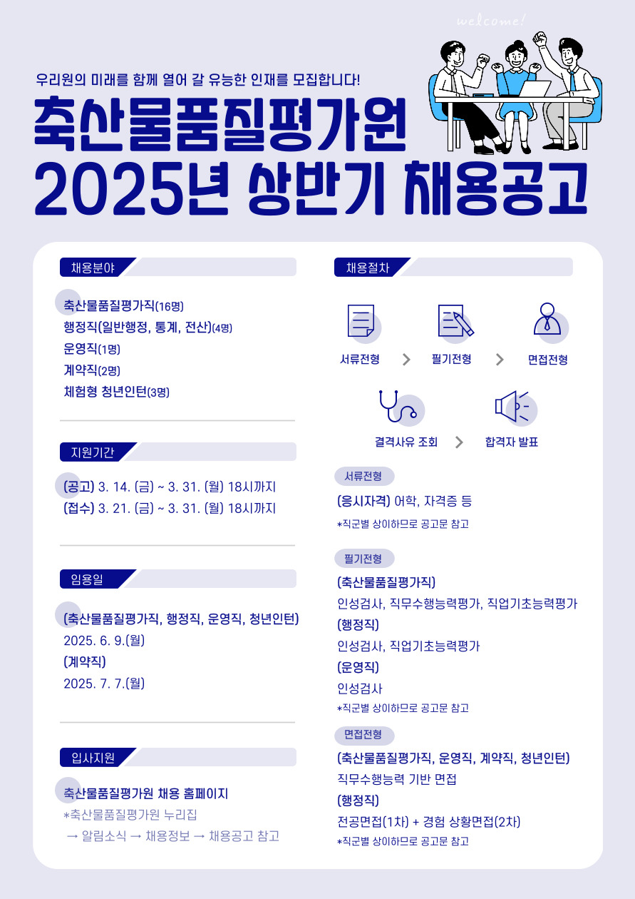 축산물품질평가원이 '2025년 상반기 신규직원 공개 채용'을 통해 축산 유통의 미래를 이끌 신규직운 26명을 채용한다.