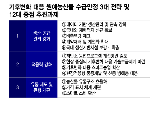 농식품부는 원예농산물의 안정적 공급을 위해 지난해 12월 '3대 전략 및 12대 중점 추진과제'를 발굴하고, 올해부터 본격적으로 과제별 세부계획을 추진 중이다. 중장기적인 관점에서 접근해야 하는 기후변화 대책 특성상 각 과제의 현장 적합성을 지속적으로 보완하기 위해 관계기관이 매월 공동으로 기후대응 포럼을 개최할 계획이다.