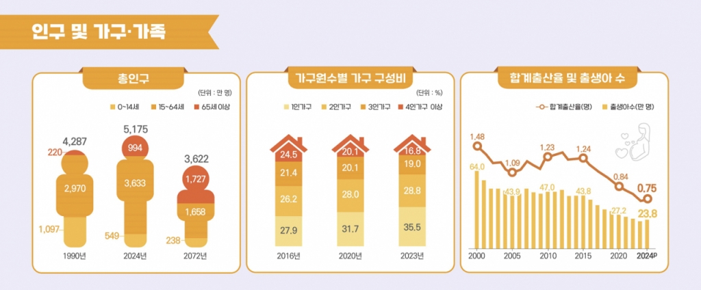 지난해 총인구는 5175만명이며 2072년 총인구는 3622만명이 될 것으로 보인다. 65세 인구 비중은 지난해 19.2%에서 2072년 47.7%가 될 전망이다. 2052년 기준 2024년보다 인구가 증가하는 지역은 세종이 유일하다.