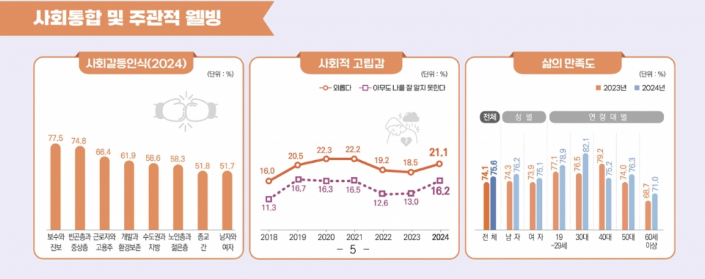 통계청이 25일 발표한 '2024 한국의 사회지표'에 따르면 한국행정연구원의 사회통합실태조사 결과 지난해 사람들이 크게 느낀 사회갈등은 '보수와 진보'(77.5%), '빈곤층과 중상층'(74.8%), '근로자와 고용주'(66.4%) 순이다.