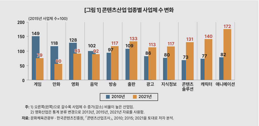 보고서에 따르면 한국 콘텐츠 산업 수출액은 2010년 32억3000만 달러에서 2021년 124억5000만 달러로 3.9배 증가하면서 매년 최고 기록을 경신 중이다. 매출액 기준으로는 2021년 137조 원으로 2010년 대비 2.3배 성장했다.
