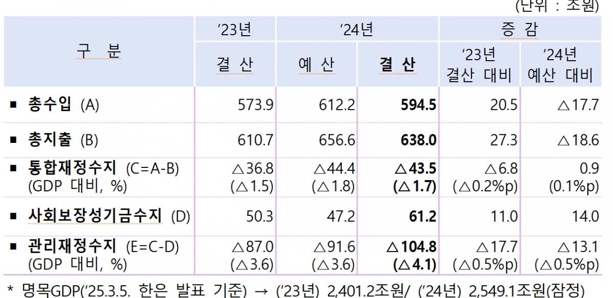 나라 살림살이를 가늠할 수 있는 관리재정수지는 104조원 적자를 기록했다. 코로나19 팬데믹 기간이던 2022년 이후 2년 만에 100조원을 넘었다. GDP 대비 관리재정수지 적자비율도 4.1%로 재정준칙 상한(3%)을 지키지 못했다.