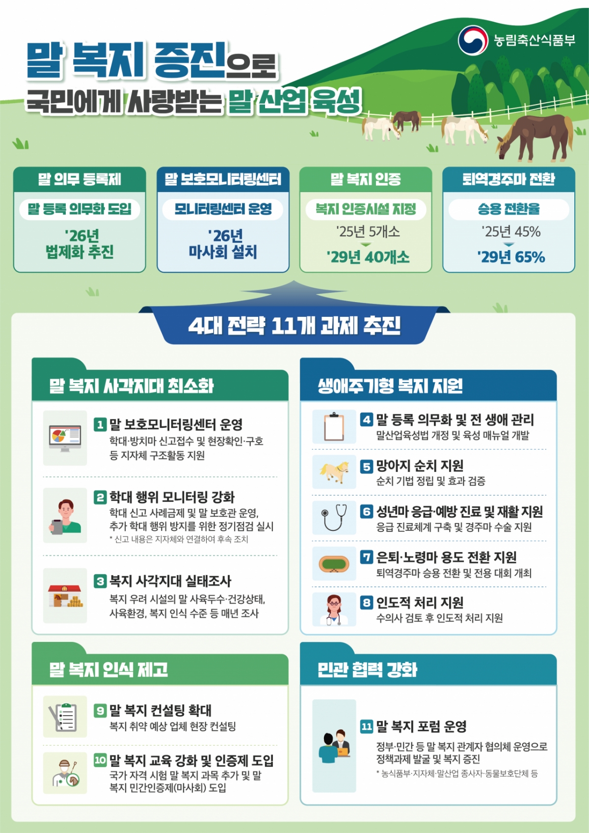 1일 농림축산식품부에 따르면 오는 2029년까지 추진되는 '2025 말 복지 제고 대책'은 국민에게 사랑받는 말산업 육성을 목표로 말 복지 사각지대 최소화, 생애주기형 복지 지원, 말 복지 인식 제고, 민관협력 강화 등 4개분야 11개 과제를 담고 있다.