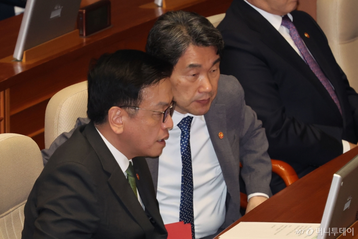 ![[서울=뉴시스] 권창회 기자 = 1일 서울 여의도 국회에서 열린 제424회 국회(임시회) 제7차 본회의에서 최상목 경제부총리 겸 기획재정부 장관과 이주호 사회부총리 겸 교육부 장관이 대화하고 있다. 2025.05.01. /사진=권창회](https://thumb.mt.co.kr/cdn-cgi/image/f=avif/21/2025/05/2025050200561388604_1.jpg)