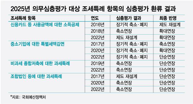 수차례 축소나 폐지가 권고됐지만 정책적 부담과 수혜계층 반발로 유지되고 있는 대표 항목은 △신용카드 소득공제(연 4조1000억원) △중소기업 특별세액감면(2조4000억원) 등이다. 신용카드 소득공제는 10회 연장됐고 중소기업 특별세액감면은 8회 연장됐다. 심층평가 결과와 일몰 연장이 무관하게 이뤄졌던 셈이다.