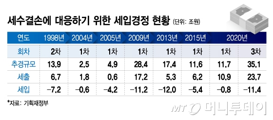 2013년의 경우 경제 상황이 갑자기 나빠졌다는 점, 새 정부 출범 직후 추경이었다는 점에서 지금과 유사하다. 2015년과 2020년에도 각각 5조4000억원, 12조2000억원(2차례 합산) 규모의 세입 경정을 편성했다.
