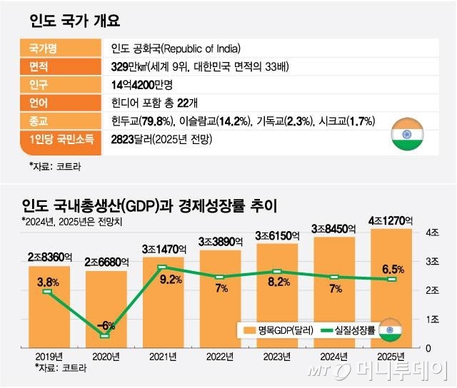 "현재 인도의 국내총생산(GDP)은 세계 5위인데 인도투자청은 올해 인도가 일본을 제치고 4위로 올라설 수 있다고 전망합니다. 연평균 6~7%대 성장이 이어지고 있고요. 글로벌 투자은행은 2028년이면 인도가 독일을 제치고 미국, 중국에 이어 세계 3위 경제 대국이 될 것으로 예상합니다."