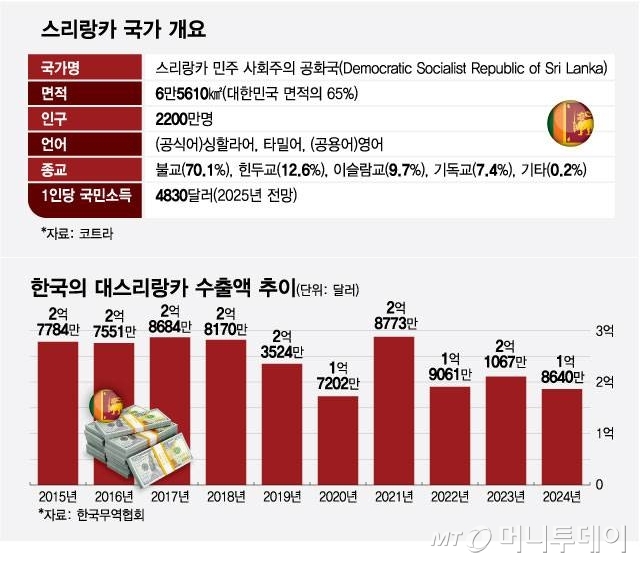 스리랑카의 국토 면적은 6만5600㎢로 대한민국의 65% 수준이다. 인구는 약 2200만 명. 1인당 국내총생산(GDP)은 3830달러(2023년 기준)로 한국의 약 10분의 1 수준이다.