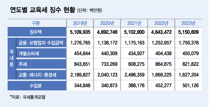 교육세는 1982년 도입된 목적세다. 전두환 정부 시절 '과외 금지' 정책과 맞물려 교사 처우 개선을 위해 도입됐다. 교육세는 금융사(금융·보험업) 수익금액의 0.5%, 교통·에너지·환경세, 주세, 개별소비세의 일정 비율로 조성된다. 최근 몇 년간 약 5조원 안팎의 교육세가 걷혔다.