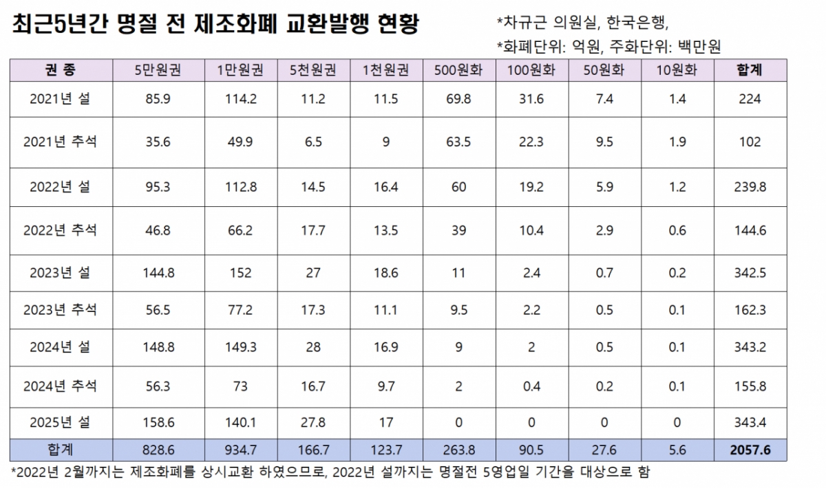 29일 국회 기획재정위원회 소속 차규근 조국혁신당 의원이 한국은행으로부터 제출받은 자료에 따르면, 한은은 올해 설 연휴 전(1월13~24일) 총 343억4000만원어치를 신권으로 교환해줬다.