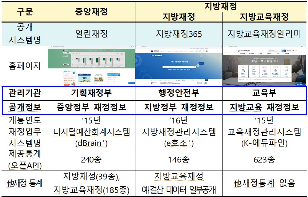 현재 재정정보 공개 시스템은 주무 부처에 따라 분산돼 있다. 중앙재정은 기재부가 '열린재정'이라는 이름으로 240종의 정보를 공개하고 있다. 지방재정은 행정안전부가 '지방재정365'에서 146종의 정보를 다룬다. 지방교육재정은 교육부 소관으로 '지방교육재정알리미' 사이트를 통해 623종의 정보가 공개 중이다.