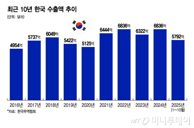 23일 한국무역협회에 따르면 올해 1~10월 누적 수출액은 5791억6600만달러로 전년 대비 2.3% 증가했다. 연초부터 미국 트럼프 행정부의 관세 정책과 글로벌 경기 둔화 가능성 등으로 수출이 역성장할 수 있다는 우려가 컸으나 현재까지 역대 최고 실적 흐름을 유지 중이다.