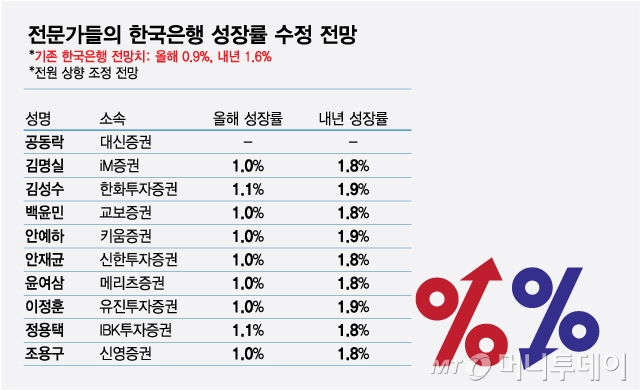새롭게 제시하는 11월 전망에선 올해와 내년 성장률을 모두 상향 조정할 가능성이 크다. 앞서 KDI(한국개발연구원)가 내년 성장률을 1.8%로 제시했고, 해외 주요 IB(투자은행)들은 1.9%로 높였다. 시장에선 비슷한 수준으로 전망치를 발표할 것으로 보고 있다.