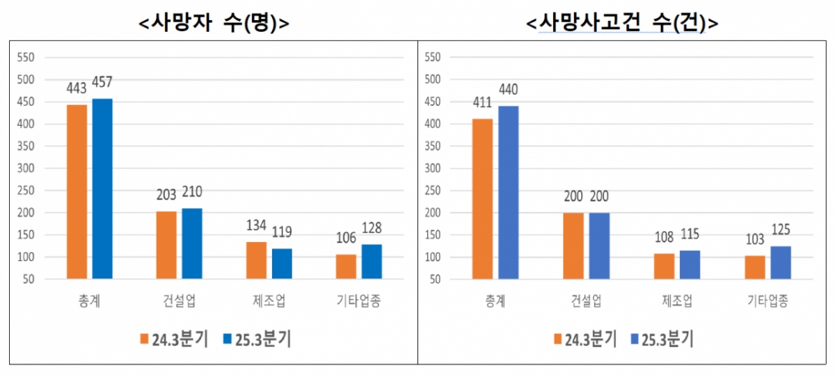 25일 고용노동부가 발표한 '재해조사 대상 사망사고 발생 현황' 잠정결과에 따르면 올해 3분기까지 누적 재해조사 대상 사고사망자는 457명으로 전년 대비 14명(3.2%) 증가했다. 사고 사망 건수는 440건으로 29건(7.1%) 늘었다.