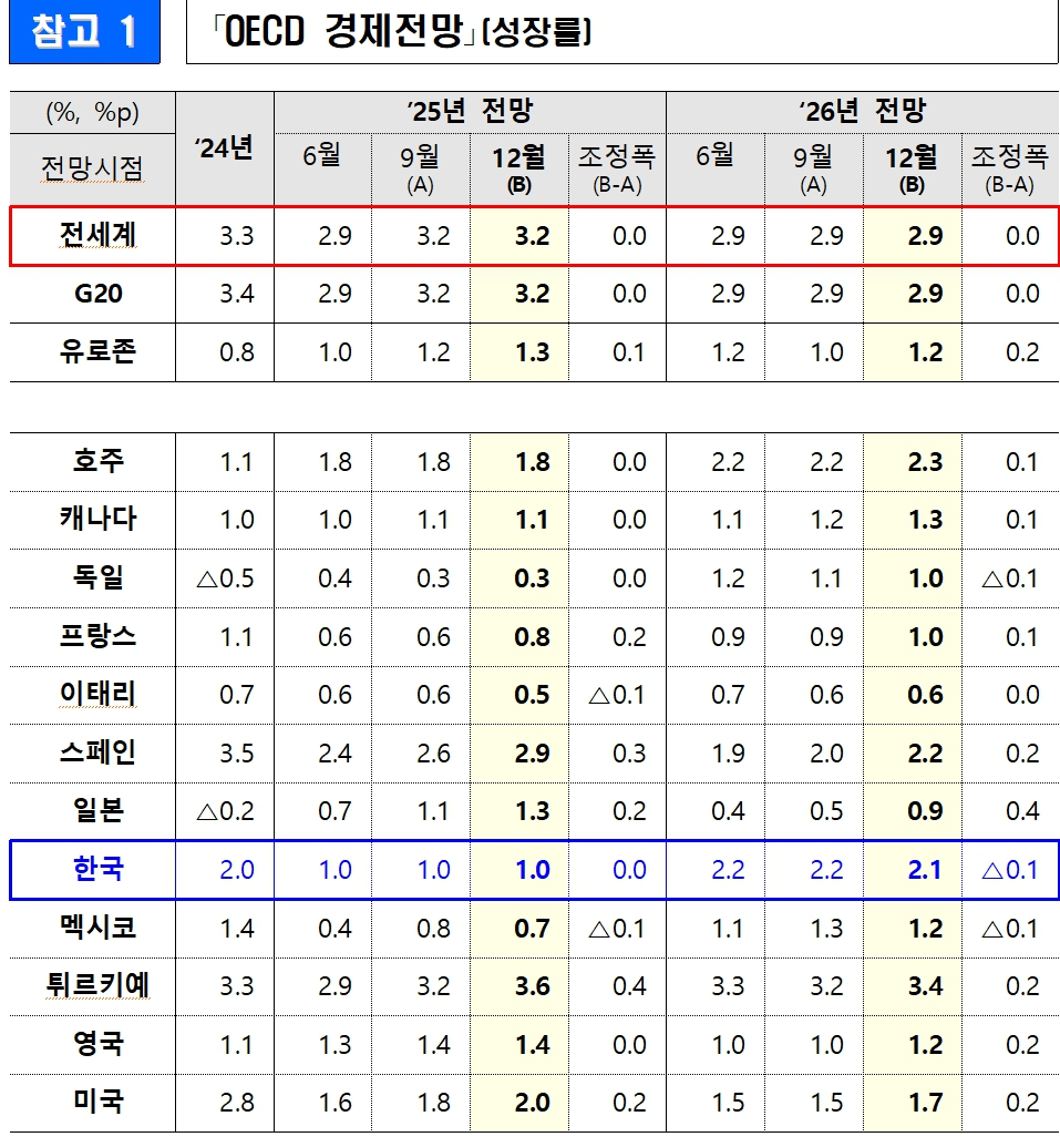 한편 OECD는 올해와 내년 세계 경제 성장률 전망치를 기존 전망과 같은 3.2%, 2.9%로 유지했다.