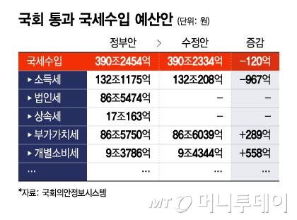 소득세가 당초 정부안(132조1175억원)보다 967억원 적은 132조208억원 걷힐 것으로 재추계된 영향이 크다.