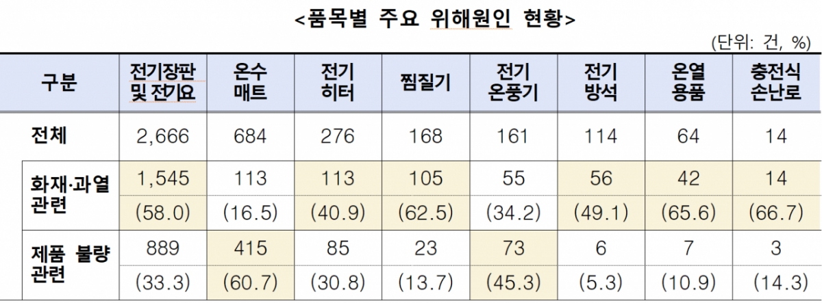 전기장판의 경우 라텍스 매트리스나 두꺼운 이불을 덮고 사용해 과열로 화재가 발생한 사례가 다수 확인됐다. 온수매트는 제품 불량 관련 사고 비율이 60.7%로 가장 높았다.