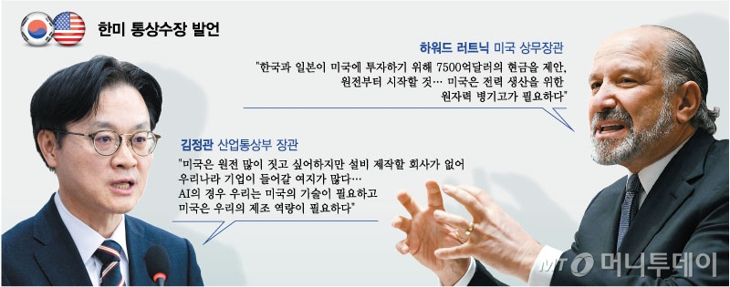 김정관 산업통상부 장관은 지난 6일 유튜브 '삼프로TV'에 출연, "한미 양국의 공통 이해관계가 형성된 분야가 있다"며 "원전의 경우 미국은 많이 짓고 싶어 하지만 미국에는 원전을 만들거나 설비를 제작할 회사가 없어 우리나라 기업이 들어갈 여지가 많다"고 말했다. 이어 "AI분야의 경우 우리는 미국의 기술이 필요하고, 미국은 우리의 제조역량이 필요하다"며 "접점을 찾으면 우리 기업이 적극적인 역할을 할 수 있다"고 부연했다.
