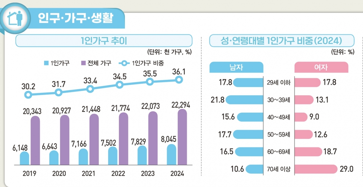 국가데이터처가 9일 발표한 '통계로 보는 1인 가구'에 따르면 지난해 1인 가구 수는 804만5000가구로 전년 대비 21만6000가구 증가했다. 전체 가구(2229만4000가구)에서 1인 가구가 차지하는 비중은 36.1%로 1년 새 0.6%p(포인트) 확대됐다.