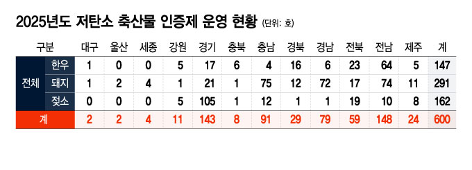 23일 농림축산식품부가 밝힌 '2025년도 저탄소 축산물 인증농장' 현황자료에 따르면 한우·돼지·젖소 등 3개 축종을 중심으로 한 전국 인증농장 수는 전체 600개로 한우 147개, 돼지 291개, 젖소 162개를 차지한다.