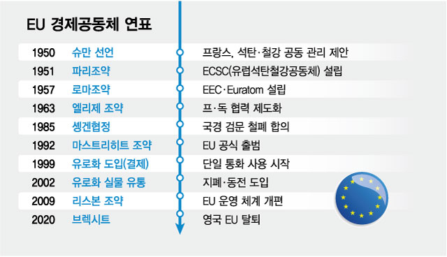 1990년대 들어 통합의 과정이 정점을 찍었다. 마스트리히트 조약으로 유럽연합(EU)이 공식 출범했다. 단일 통화인 유로화 도입도 결정됐다.