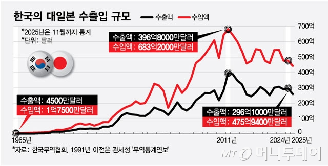 1일 한국무역협회에 따르면 1965년 2억2000만달러던 한·일 무역 규모는 2024년 772억달러로 352배 급증했다. 2011년 1080억달러로 정점을 찍은 뒤 최근엔 700억~800억달러 선을 유지 중이다.