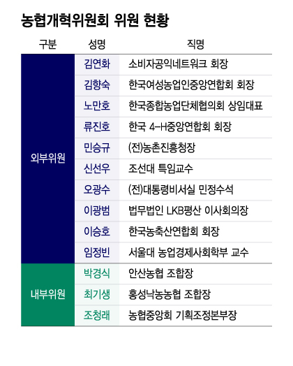 한편 농협중앙회는 오는 20일 오후 2시 서울 중구 본관 2층 중회의실에서 농협개혁위원회 첫 회의를 열고 개혁위 운영방안 및 향후 계획 등을 논의할 계획이다.
