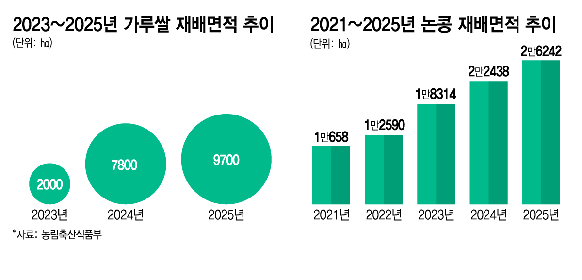 공격적으로 육성되던 가루쌀·논콩이 분기점에 멈춰섰다. 재배면적을 늘리지 않고 소비를 촉진하는 방향으로 정부 기조가 전환되면서다. 올해부터 '수급조절용 벼'가 도입되면 변화가 한층 두드러질 것으로 보인다. 가루쌀·논콩의 전략작물직불 지원 면적이 축소될 것이란 우려도 나온다.