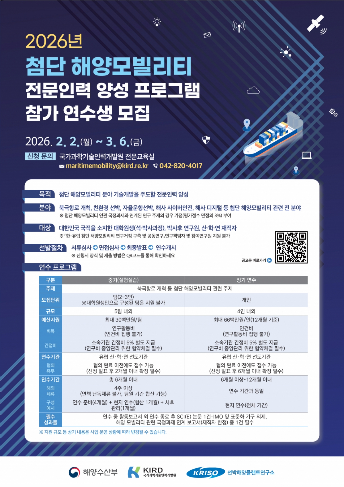 한편 '2026년 첨단 해양모빌리티 인력양성 사업' 지원자 모집 공고는 국가과학기술인력개발원 누리집(www.kird.re.kr)에서 확인하거나 유선(042-820-4024)으로 문의하면 된다.