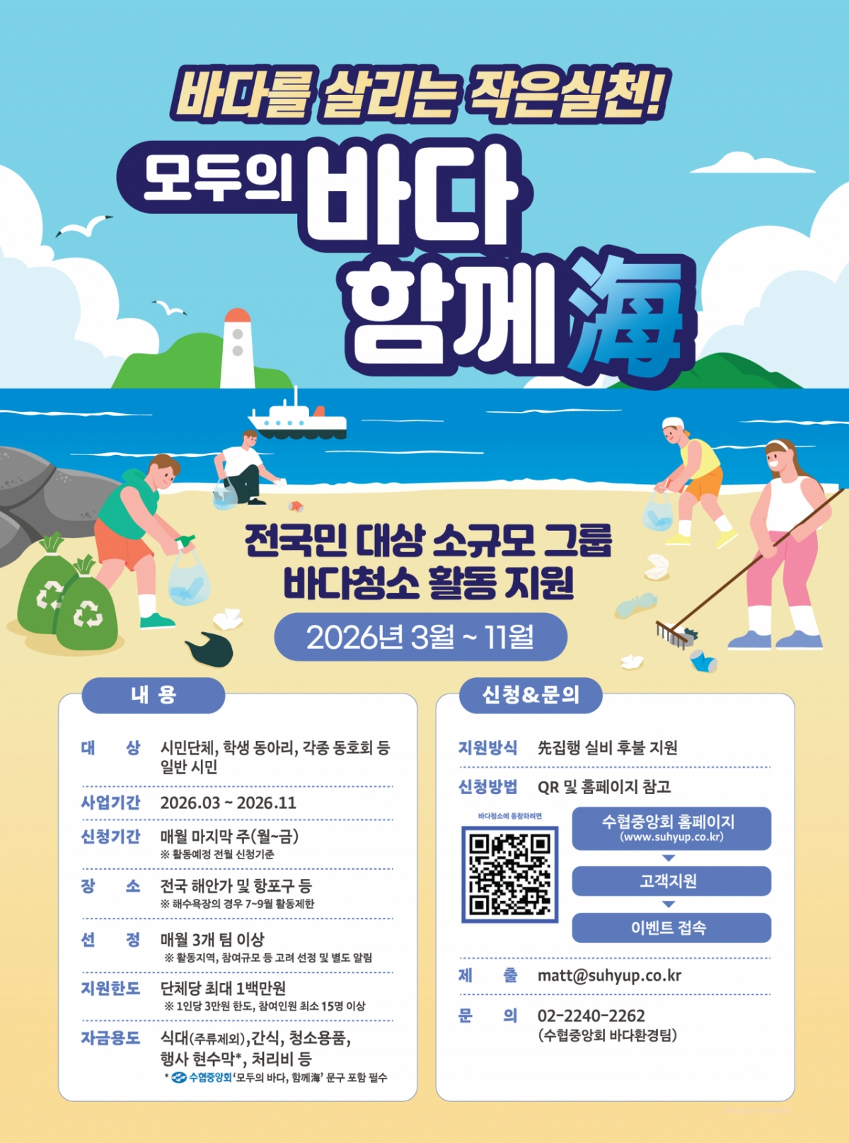 노동진 수협중앙회장은 "많은 국민이 더 쉽고 든든하게 바닷가 정화 활동에 참여할 수 있도록 신청 요건은 낮추고 지원은 확대했다"며 "우리 바다를 깨끗하게 지키는 실천에 국민들의 많은 관심과 참여를 부탁드린다"고 강조했다.