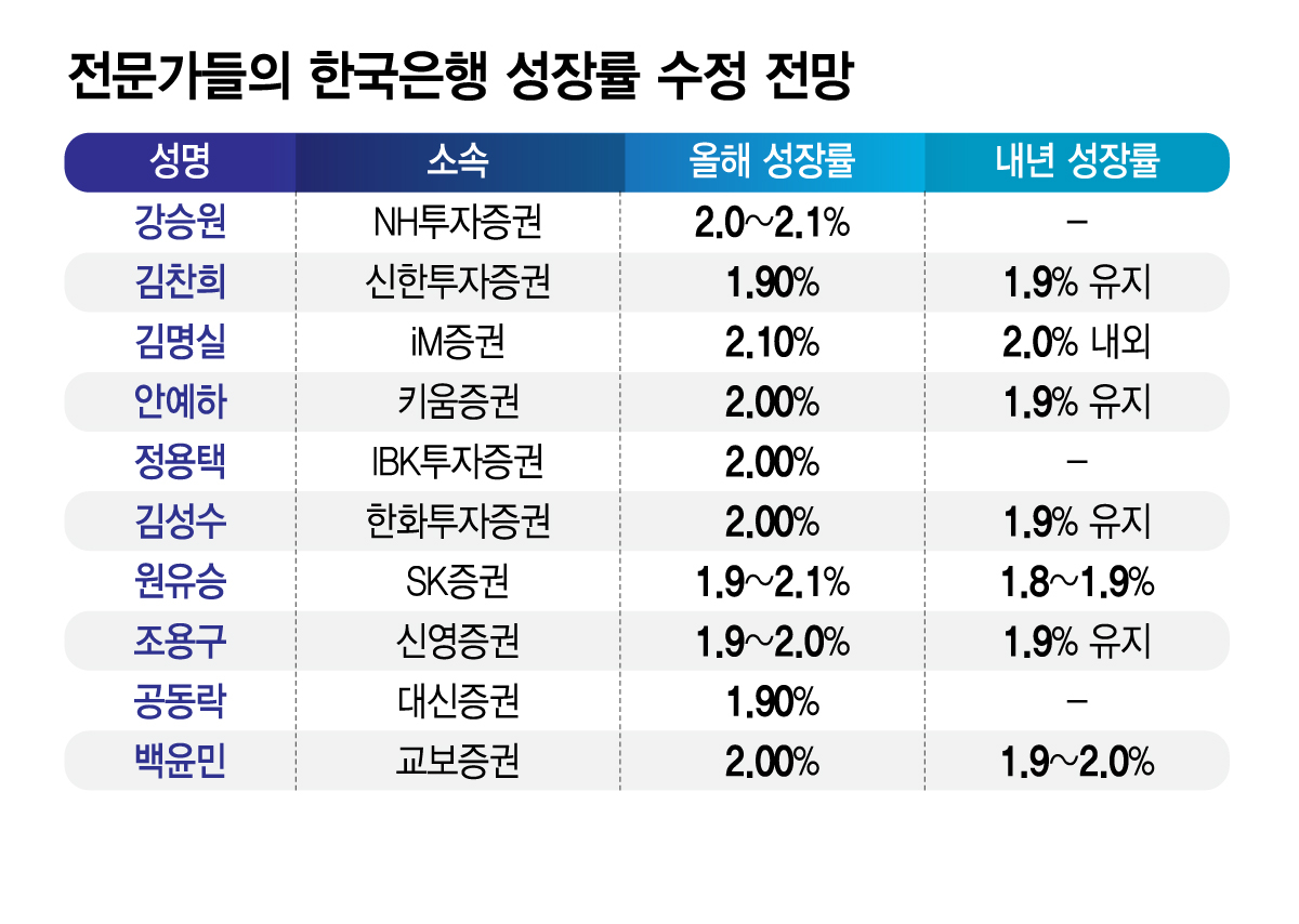 전문가들은 특히 이번 금통위에서 발표될 수정경제전망에 주목했다. 올해 한은의 성장률 전망치는 기존 전망치인 1.8%보다 소폭 상향된 1.9~2.1% 로 조정될 가능성이 높다는 의견이 지배적이다. 반도체를 중심으로 한 수출 개선이 예상보다 강하게 나타나고 있다는 점이 근거로 꼽힌다.