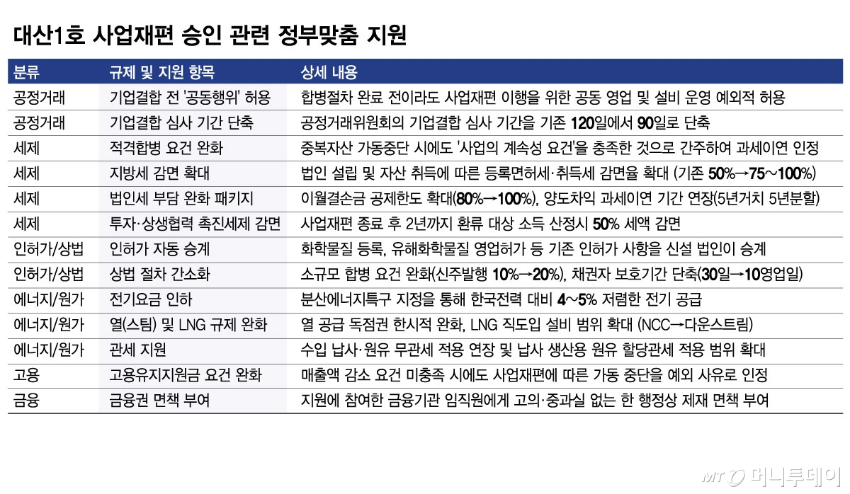 기업이 뼈를 깎는 자구책을 내놓으면 정부는 법과 제도를 고쳐서라도 뒷배가 되겠다는 의지를 보여줬다. 석유화학산업 재편을 추진하는 정부의 기조가 '규제철폐를 통한 맞춤형 지원'으로 구체화한다. '대산 1호 프로젝트'에서 보여준 정부의 파격적인 당근책이 남은 사업재편 대기 기업들에 어떤 이정표가 될지 관심이 쏠린다.