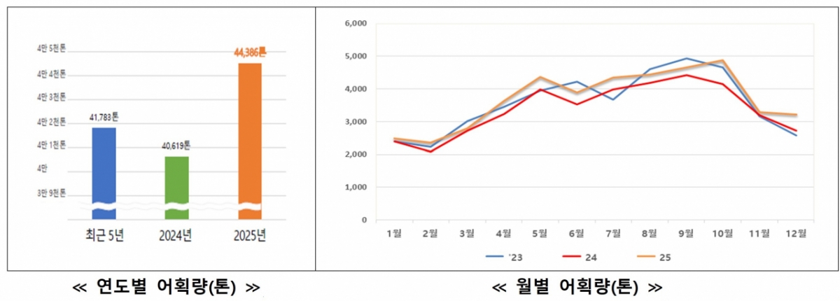 2025년 연근해어업 생산량은 총 97만8000톤으로, 전년(84만1000톤) 대비 16.3%, 최근 5년 평균(91만2000톤) 대비 7.2% 증가하며 회복세를 나타냈다. 생산 금액은 총 4조5656억원으로 각각 전년 대비 9.4%, 최근 5년 평균 대비 8.1% 증가한 것으로 집계됐다.