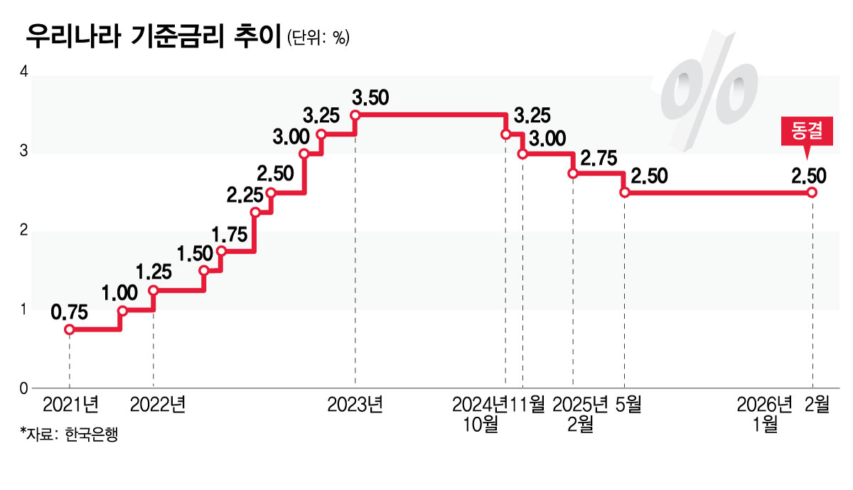 한은 금통위는 26일 서울 중구 한은 본관에서 통화정책방향 결정회의를 열고 기준금리를 연 2.5%로 동결했다. 동결 결정은 7명 금통위원 전원 만장일치로 이뤄졌다.
