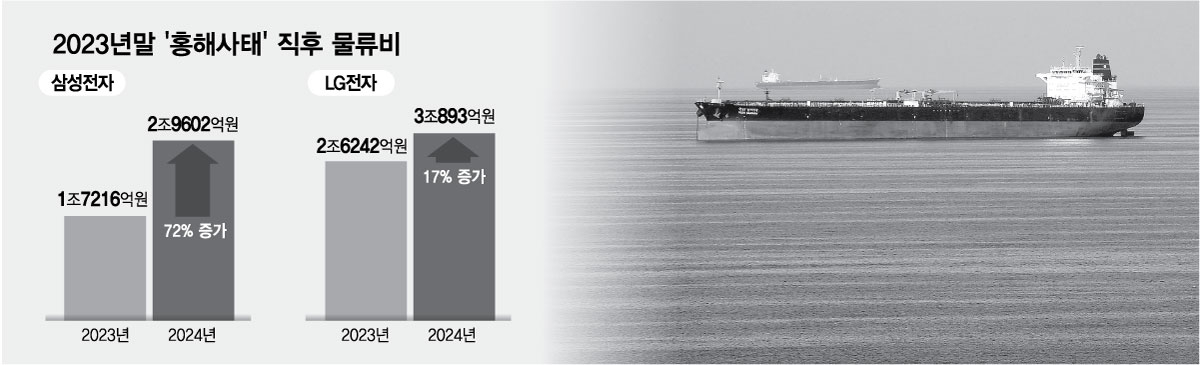 냉장고와 세탁기, TV 등 완제품 가전은 대부분 해상운송에 의존해 운임변동의 영향을 크게 받는다. 홍해사태가 대표적이다. 당시 홍해지역의 지정학적 불안으로 선사들이 아프리카 희망봉을 거치는 우회운항에 나서면서 운임이 급등했다. 홍해사태 직후인 2024년 삼성전자는 연간 물류비로 2조9602억원을 집행했다. 전년(1조7216억원) 대비 약 72% 증가한 금액이다. LG전자 역시 같은 기간 물류비가 2조6242억원에서 3조893억원으로 약 17% 증가해 비용부담이 늘어났다.