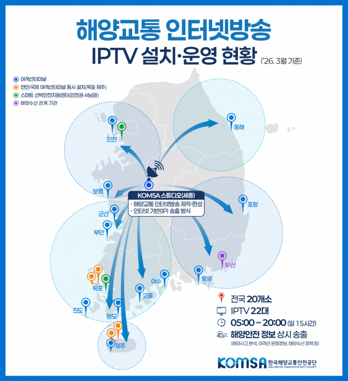 전국 여객선터미널 등 20개소에 설치된 아이피티비(IPTV: 인터넷텔레비전) 송출장치를 통해 다양한 해양안전 정보가 상시 송출되는 구조로 운영된다.