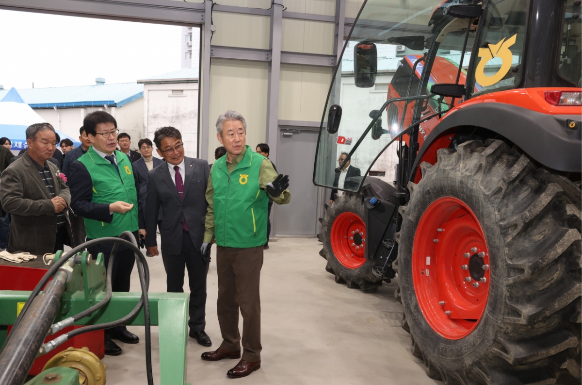 이날 강호동 회장은 자율주행 트랙터와 드론 등 첨단 농기계를 둘러보고 실시간 모니터링으로 농기계 이상징후를 파악하는 '농기계 AI 원격관리 시스템'을 점검했다. 스마트 진단기를 활용해 접촉 불량 상태의 트랙터를 직접 수리 시연하며 현장 기술력도 확인했다.