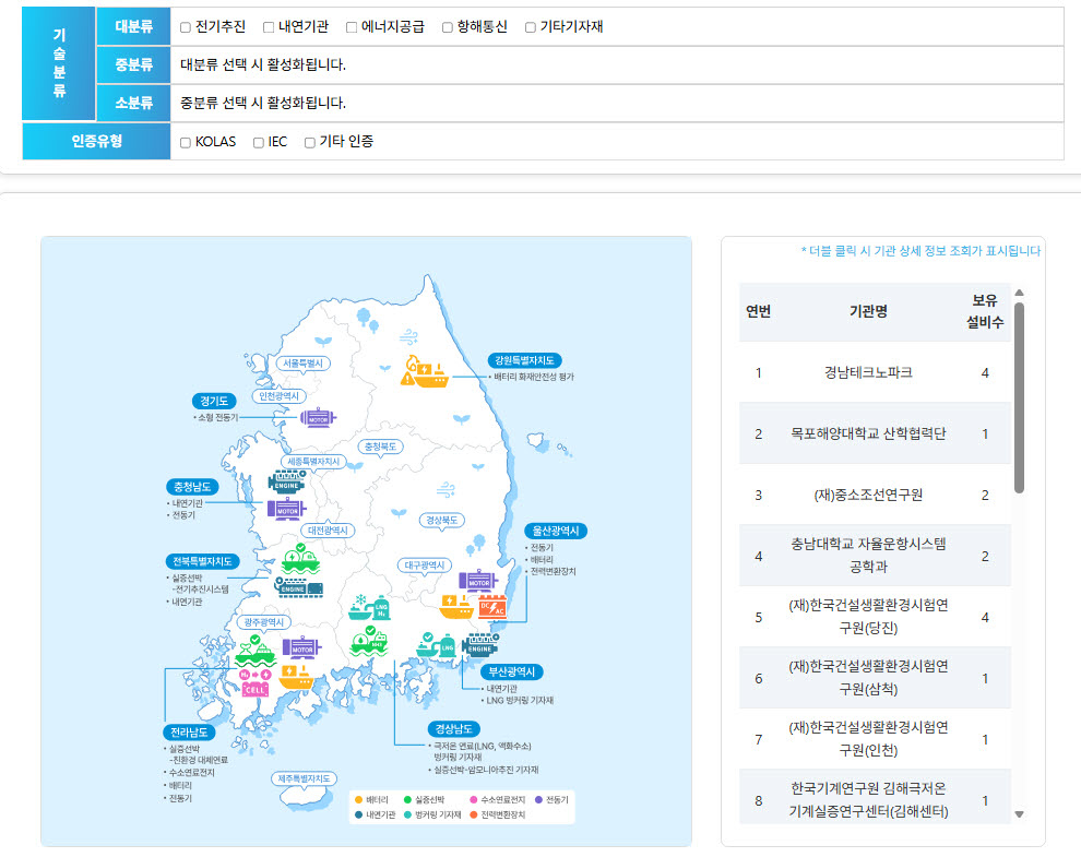 사용자는 해당 플랫폼에서 기자재 주요기능, 시험운영기관, 인증유형 등 전국의 총 119개 친환경선박·기자재 시험설비 정보를 쉽게 찾을 수 있고 지도를 기반으로 시험기관 위치 등도 한눈에 확인할 수 있다.
