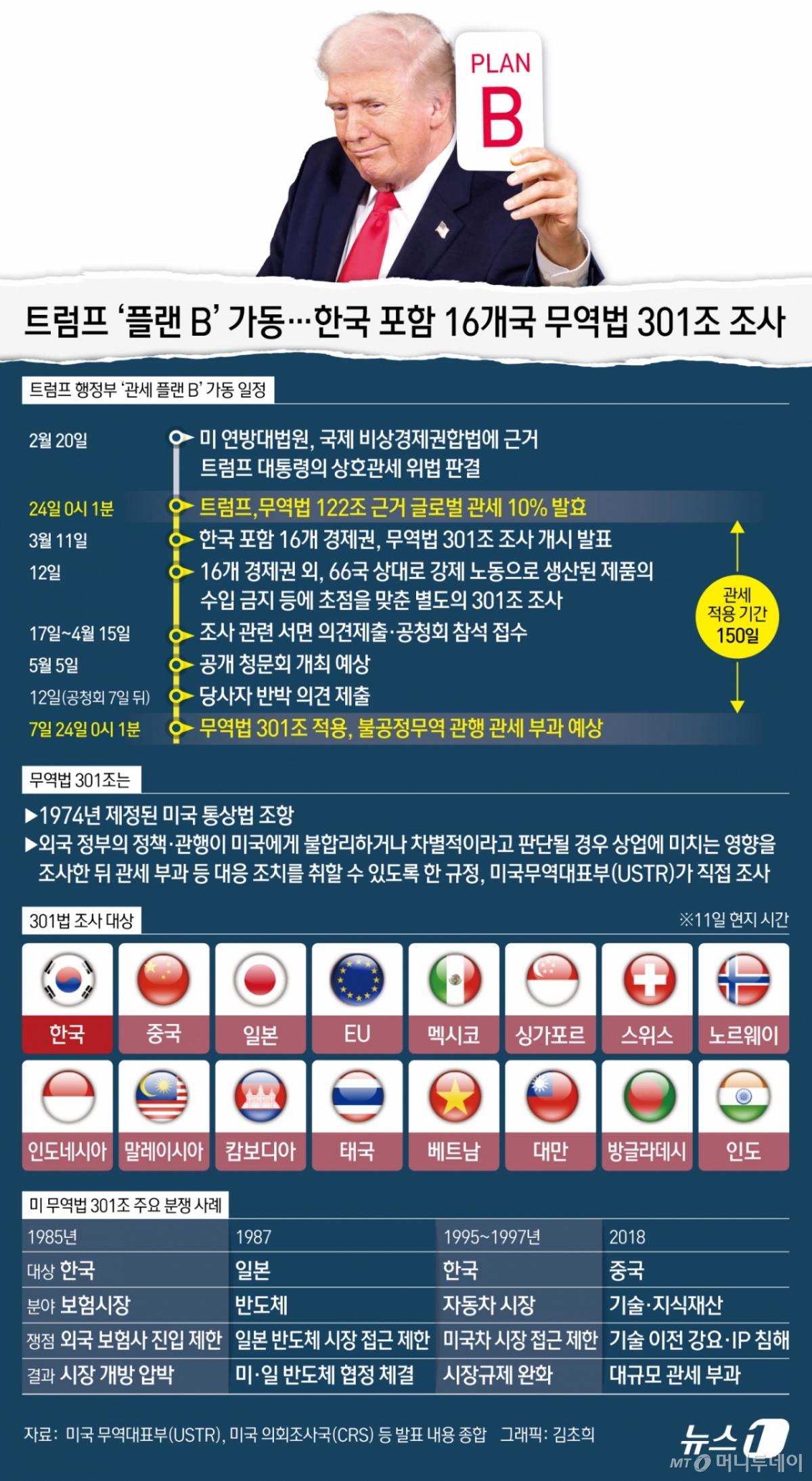 한미 양국의 기존 합의 상호관세율은 15%다. 현재는 122조에 근거해 10% 관세율을 7월까지 적용 받는다. 미정부는 301조를 통해 15% 관세 부과를 목표로 할 것으로 보인다.