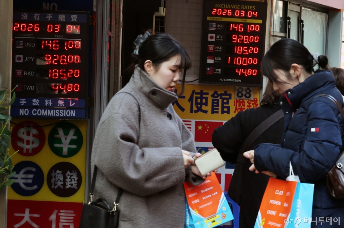 ![[서울=뉴시스] 박주성 기자 = 4일 서울 중구 명동의 환전소 전광판에 환율 시세가 표시되고 있다. 원·달러 환율은 이날 새벽 야간 거래에서 1506.5원으로 장중 고점을 찍으며 2009년 3월 이후 약 17년 만에 처음으로 1500원을 돌파했다. 2026.03.04. park7691@newsis.com /사진=](https://thumb.mt.co.kr/cdn-cgi/image/f=avif/21/2026/03/2026031318020178013_1.jpg)