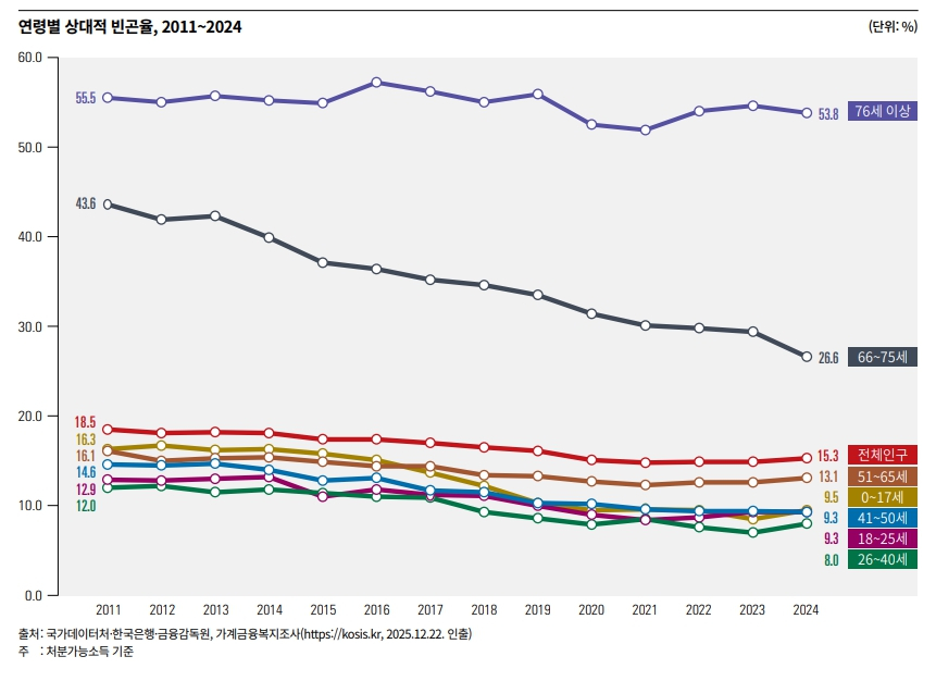 세부적으로 66~75세 인구 빈곤율이 2011년 43.6%에서 2024년 26.6%로 크게 개선된 반면, 76세 이상 인구 상대적 빈곤율은 같은 기간 55.5%에서 53.8%로 감소하는 데 그쳤다.
