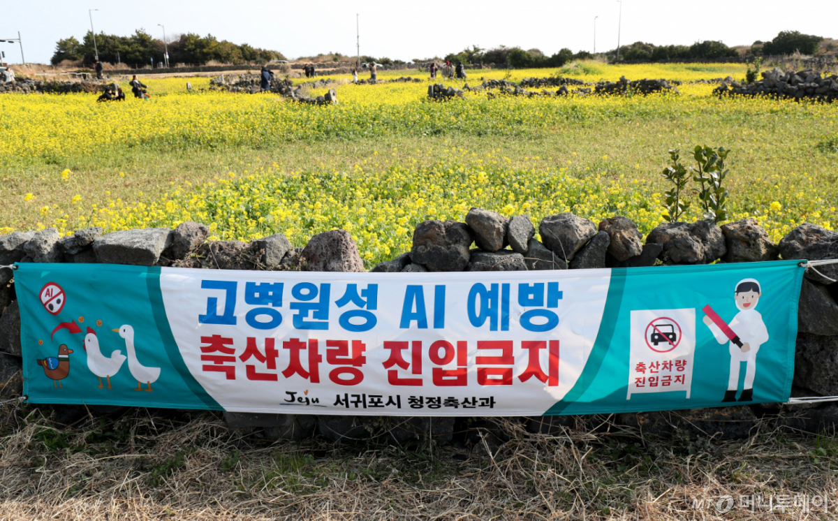 ![[서귀포=뉴시스] 우장호 기자 = 14일 오후 제주 성산일출봉 인근 광치기 해안가에 서귀포시 청정축산과에서 제작한 '고병원성 AI 예방 축산차량 진입금지' 안내문이 게시돼 있다. 제주도는 서귀포시 성산읍 시흥리 해안에서 조류인플루엔자가 확인됨에 따라 반경 10㎞ 이내 가금류 사육 농가에 이동 제한 조치도 내린 상태다. 2026.01.14. woo1223@newsis.com /사진=우장호](https://thumb.mt.co.kr/cdn-cgi/image/f=avif/21/2026/04/2026040111085020287_1.jpg)